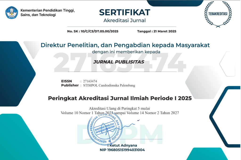 Jurnal Publisitas (p-ISSN 2252-4150) and (e-ISSN 2716-3474) is a peer-reviewed journal which is published by Lembaga Penelitian dan Pengabdian Masyarakat (LPPM), Sekolah Tinggi Ilmu Sosial dan Ilmu Politik (STISIPOL) Candradimuka, Indonesia. Starting 2019, Jurnal Publisitas publishes biannually in April and October. This journal publishes current concept and research papers on political science and government, political issues, gender, public services, political communication, media, culture from interdisciplinary perspective. Jurnal Publisitas has been categorized in SINTA accredation National Journal with Decree Number 10/C/C3/DT.05.00/2025. Jurnal Publisitas has become a CrossRef Member since the year 2020. Therefore, all articles published by Jurnal Publisitas will have unique DOI number. Review process employs a double blind review, which means that both the reviewer and author identities are concealed from the reviewers and vice versa.
